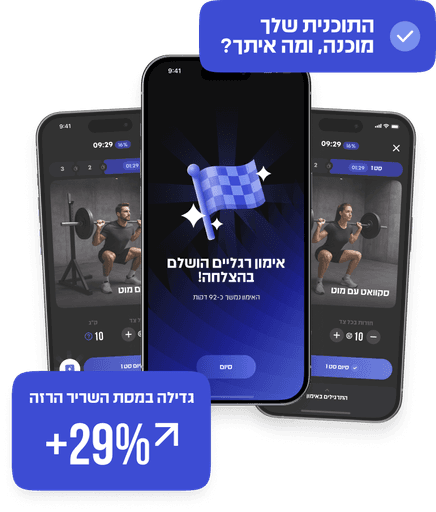 שאלה מעולה! בעזרת בינה מלאכותית מתקדמת, אנחנו מתאימים את רמת הקושי של התוכנית אליכם, כדי לשמור על מאמץ אופטימלי לתוצאות. בסוף כל תרגיל המערכת מעריכה האם רמת הקושי הייתה גבוהה מדי, ומתאימה את הקושי לפעם הבאה.